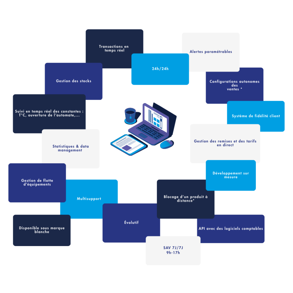Notre solution comprend une plateforme web dédiée très complète. Vous suivez en temps réel les ventes et les stocks tout en ayant accès à un espace de maintenance pour gérer le remplissage selon vos besoins.